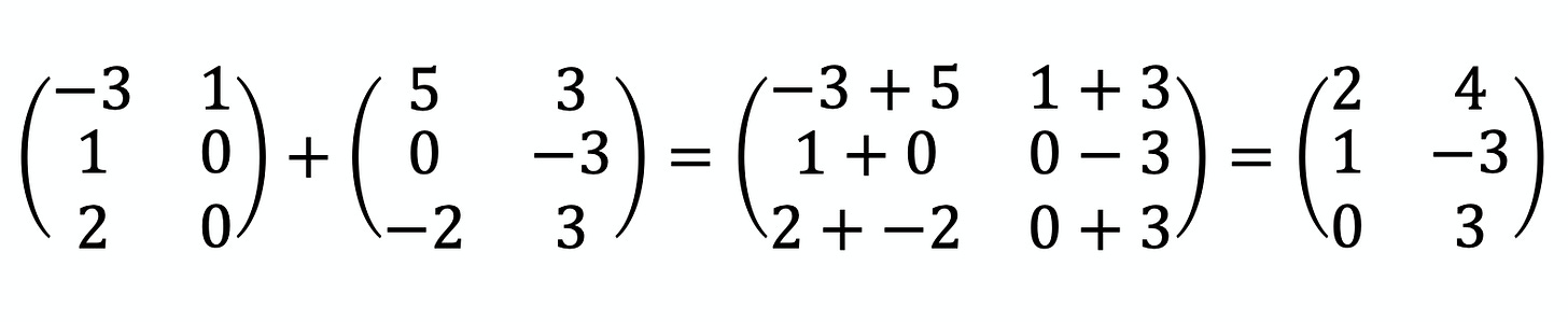 Le résultat est une matrice de la même taille, et chaque valeur est la somme des deux valeurs correspondantes dans A et B.