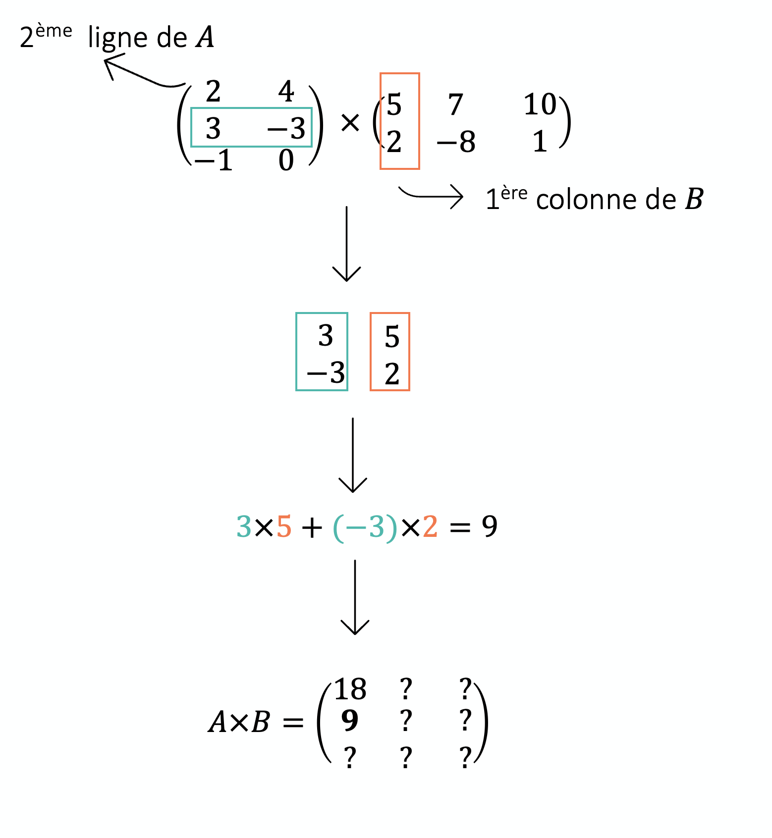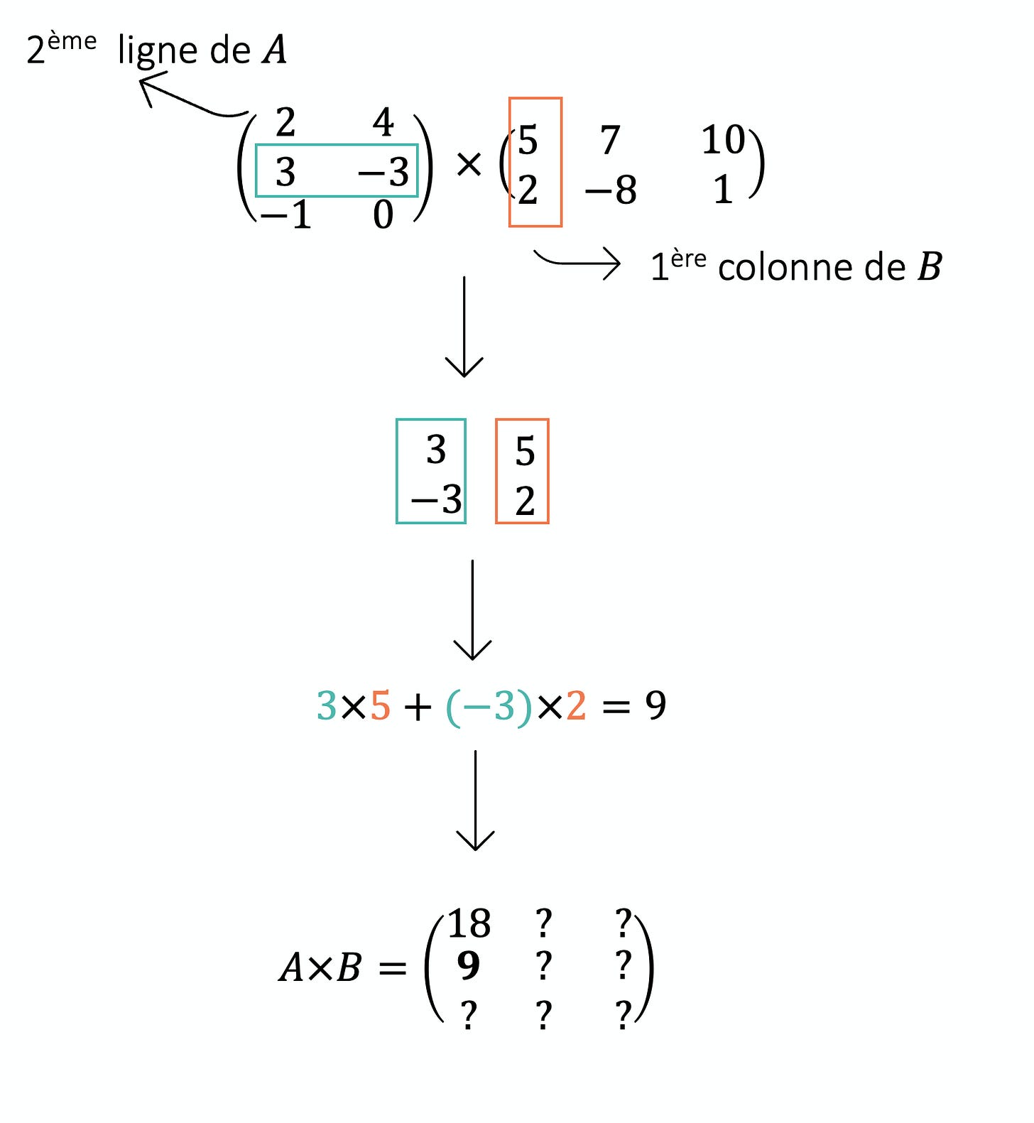 On répète ça pour chaque ligne de A et chaque colonne de B, ce qui nous donne une nouvelle matrice.